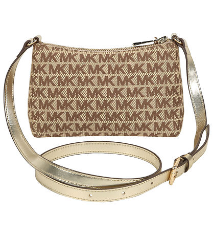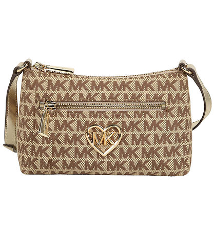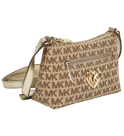 Beautiful Michael Kors shoulder bag in beige melange cotton with an all-over pattern in brown with the initials "MK", and on the front there is a gold-colored metal heart with the initials "MK" in the middle. The Bag has a gold-coloured shoulder strap made of imitation leather.