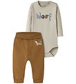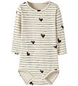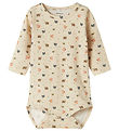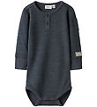 The Name It bodysuit has long sleeves and narrow ribbed edges at the throat and the leg openings. It opens at the left shoulder and between the legs with practical push buttons.