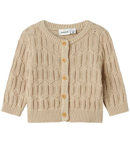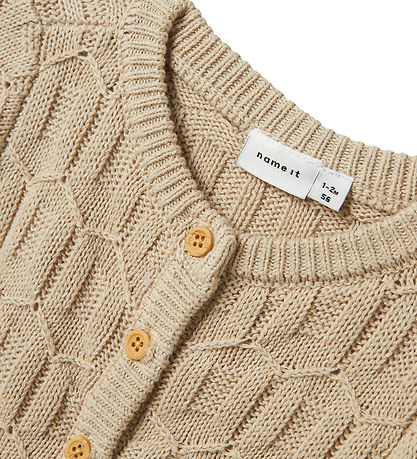 Beautiful Name It cardigan in a light beige shade that has a beautiful knitted pattern with geometric structures. The Cardigan from Name It is equipped with a practical button closure at the front with pull buttons.