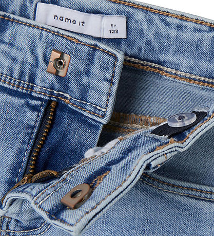The Name It jeans close with a push-botton at the front, and they can be tightened around the waist with internal, adjustable elastics. The Trousers have open pockets at the front, with a little coin pocket on the right side and two open pockets at the back, as well as practical belt loops at the waist. The jeans are in a nice and stretchy quality.