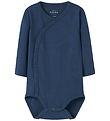 Elegant Name It wrap bodysuit in navy blue. It has long sleeves and a practical asymmetrical button closure that runs from the shoulder down to the bottom. The Name It wrap bodysuit has soft edges at the sleeves, which gives a simple expression. The button closure makes it easy to open and close the bodysuit at the bottom for easy dressing.
