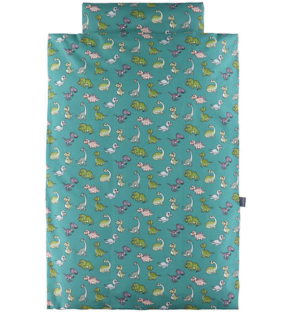 Fine Nørgaard Madsens bedding in green with a colorful allover dinosaur print.