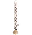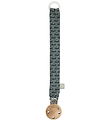 The Smallstuff pacifier clip has a white siliconering at one end and a metal clip at the other, just for attaching to the kid's clothes. The metal clip is covered with a wooden knob.