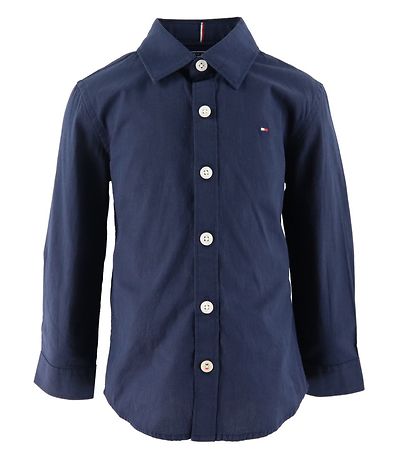 Lovely Tommy Hilfiger shirt in solid navy in an lightly stretchable quality and with white buttons. It has a small logo embroidered at the front, and the button at the bottom is sewn with a red, a white and a navy-coloured thread.