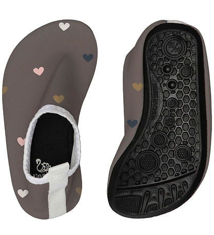 Cute Vanilla Copenhagen beach shoes in brown with hearts in different colours. There is a white strap with heel strap at the back.