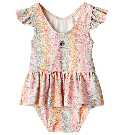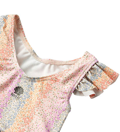 Beautiful Wheat swimsuit with floral stripes that create a rainbow pattern in orange, pink, blue and purple shades.