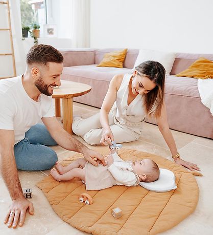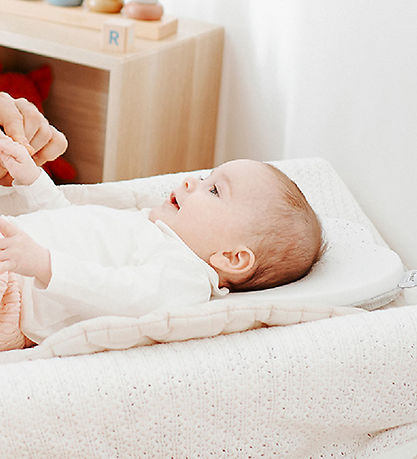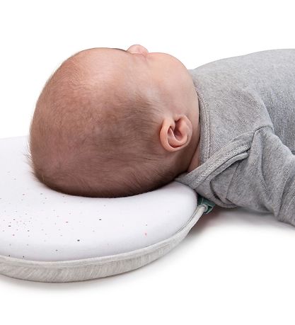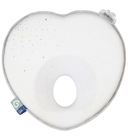 The Babymoov cushion is shaped like a heart with a recess and a hole where the head should lie. The design and the soft, ergonomic and breathable foam support the kid's head, and the cushion is made to help avoid the development of a flat back of the head.