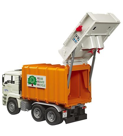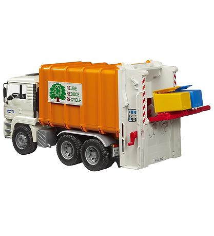 Cool Bruder truck, which is a realistic model of a MAN TGA garbage truck with two bins. The truck is in a white and orange color theme and looks completely like the real thing in the 1:16 scale.