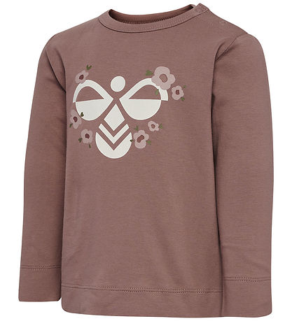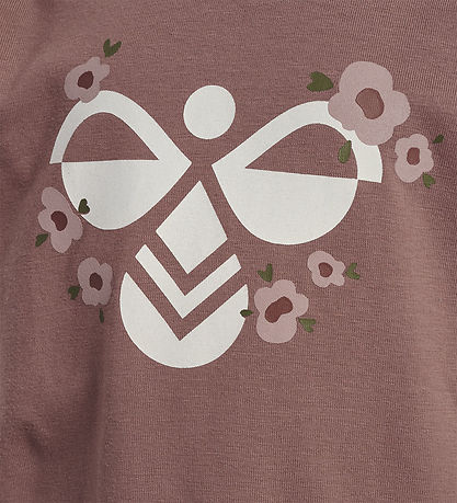 Sweet Hummel blouse in dusty purple with a large, white logo print on the chest with small flowers around in purple and green.