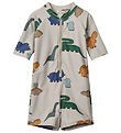 Fine Hust and Claire coverall swimsuit in a light beige colour, decorated with a fun T-rex print.