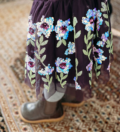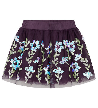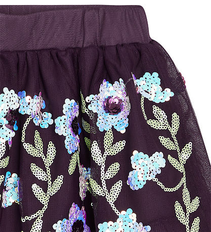 Beautiful Hust and Claire skirt in dark purple tulle with floral motifs, formed by sequins in shades of green, blue and purple.