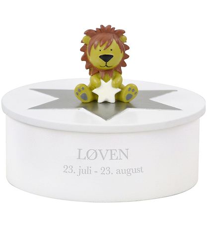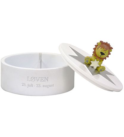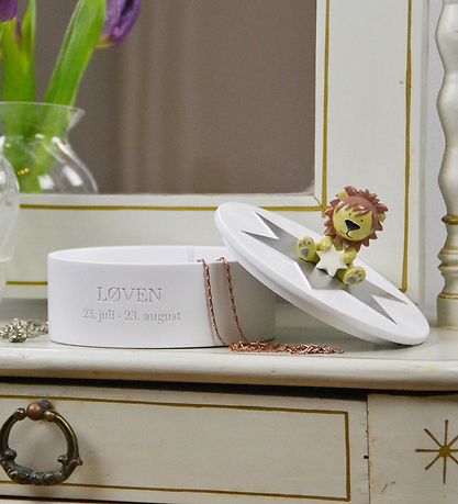 Beautiful Kids by Friis trinket box in white with the zodiac sign the Lion. On top sits a cute figure, which should illustrate the zodiac sign, and the figure is holding a star that glows in the dark. On the front is written "LION" and the zodiac period.