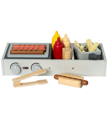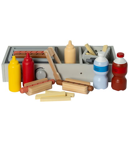 Colorful MaMaMeMo play food that depicts a hot dog stand with fries and a hot dog roaster, and includes 4 hot dogs, two hot dog buns, french fries and various accessories. Play becomes even more fun with MaMaMeMo play food.