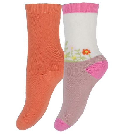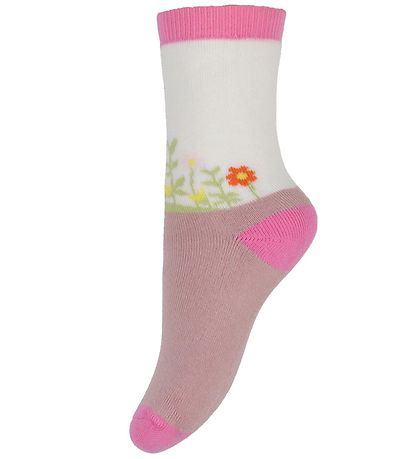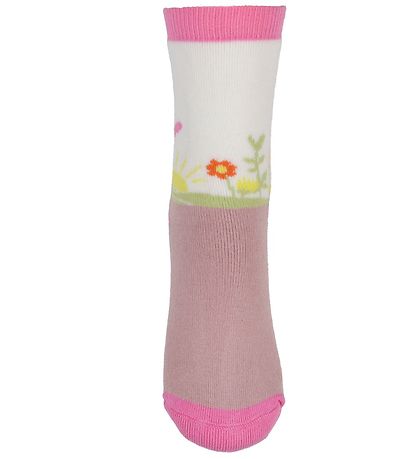 - Rose and white with a print of a sun, butterfly and flowers. The heel, toe and ribbed edge are pink