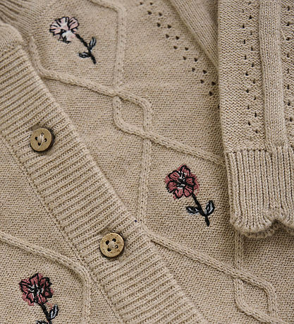 Charming Minymo cardigan in a soft beige shade with decorative knitted details. The Minymo cardigan has embroidered flower applications in delicate colours on the front, which adds a nice touch. The Cardigan has a round neckline with ribbed edges and button closure at the front. The sleeves are finished with a wavy edge, which is also repeated at the bottom of the cardigan and in the neckline.
