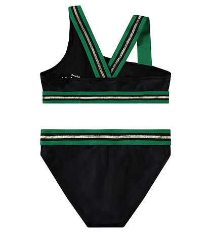 Smart Molo bikini in black with dark green elastic edges with black and gold stripes.