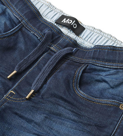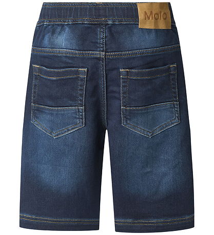 Great Molo shorts in dark blue sweat denim. The Molo shorts are a long model with a tight fit. They have a wide elastic edge that can be tightened at the front with a lace. The Shorts have practical pockets both at the front and back.