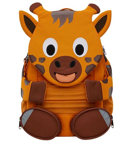 Smart Affenzahn backpack in orange and brown, shaped like a giraffe. In front there are two ears, two antennae and a pink tongue. The tongue is attached with an elastic band, so when you pull it a name tag appears. There are reflexes on the giraffe's feet.