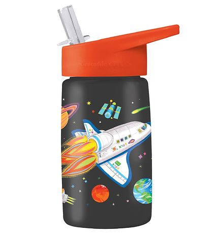 Fine Crocodile Creek water bottle in transparent black with a print of a space shuttle in outer space. The lid is orange with a transparent straw.