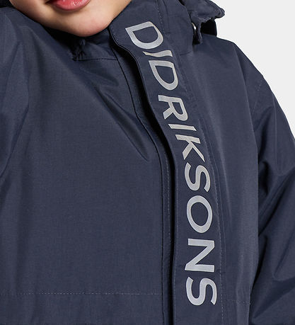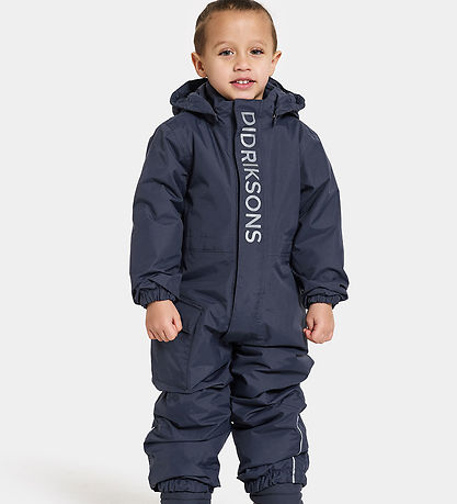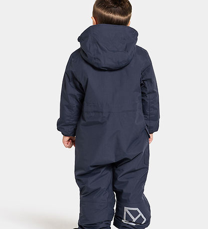 Nice Didriksons snowsuit in navy blue. At the front there is a large, vertical "Didriksons" reflex print, while at the back, on the lower right leg, there is a logo reflex print.
