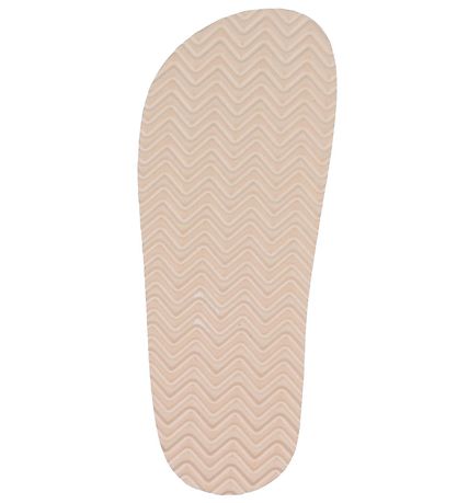 Beautiful Fila beach sandals in light pink with a gold strap and "Fila" embroidered on the strap in beige.