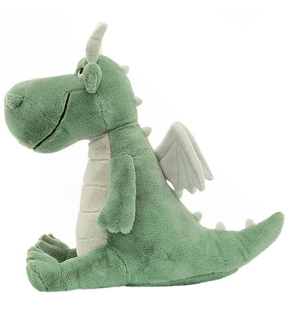 Lovely Jellycat soft toy shaped like a green dragon, with a smiling face, wings, horn and spikes on its back.