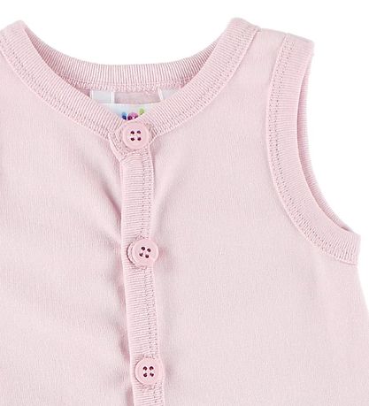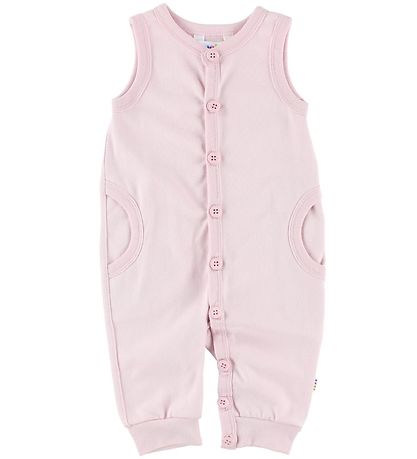 Really cute Joha romper in pink with ribbed edges around all openings. At the front, there is a pocket on each side.