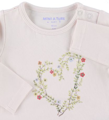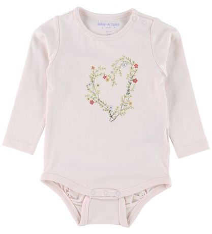 Cute Mini A Ture bodysuit in light powder rose with a heart of green leaves with flowers in red, blue and yellow.