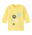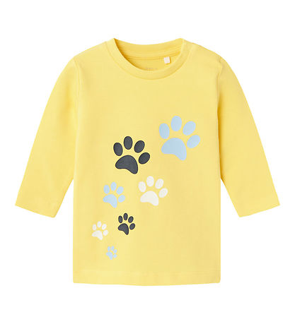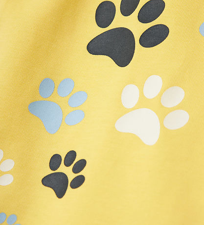 Beautiful Name It blouse in yellow, with a print on the front of paw prints in white, black and blue.