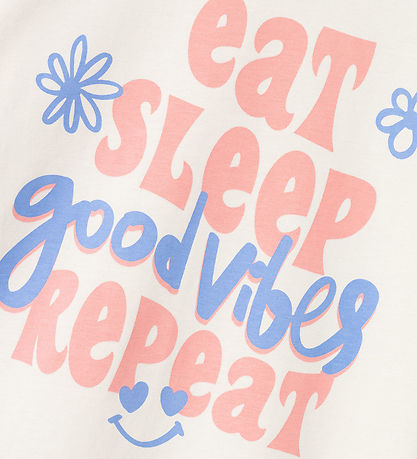Nice Name It blouse in off white with a fine flowers and text print on the front in pink and purple.