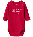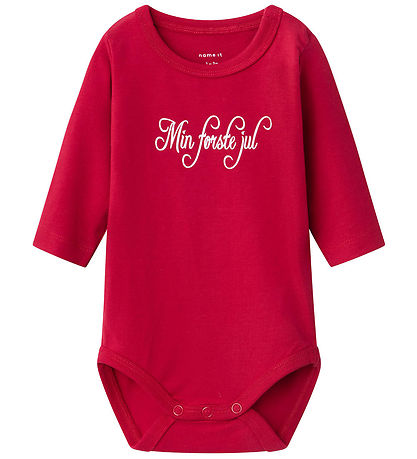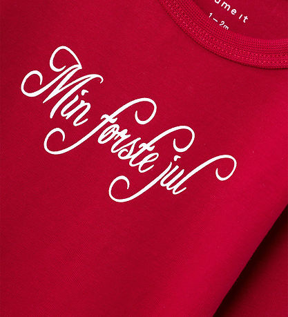 Cute Name It bodysuit in red with a fine white text print on the chest that says "My first Christmas".