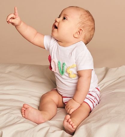 Wonderful Name It shorts in a light and stretchy quality crepe in white with transverse, red stripes.