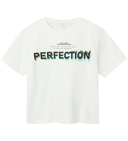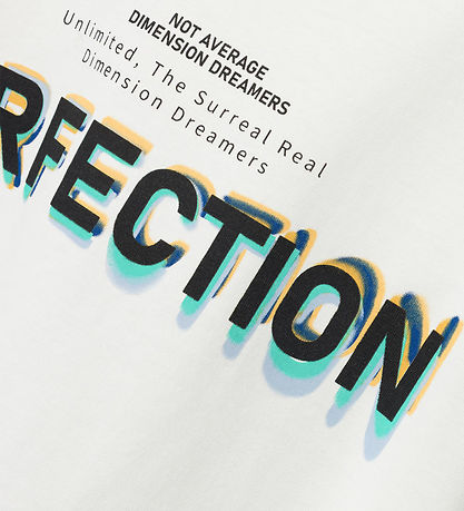 Cool Name It t-shirt in white with a text pint of "Perfection" in black with colorful shadows, as well as other text in black.