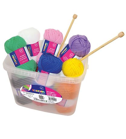 The Playbox yarn set contains ball of wool in beautiful colours: red, orange, brown, yellow, petrol, blue, rose, purple, black, green, white and grey. The set offers many hours of fun and entertaining creativity.