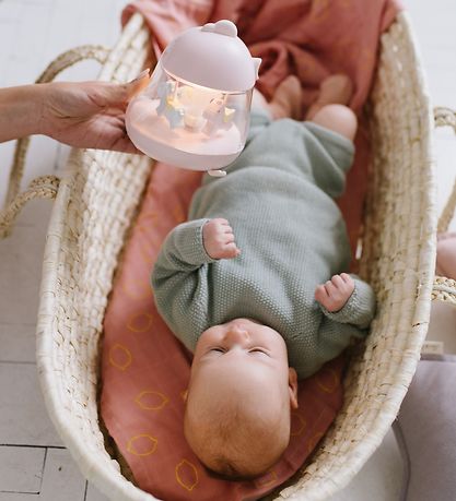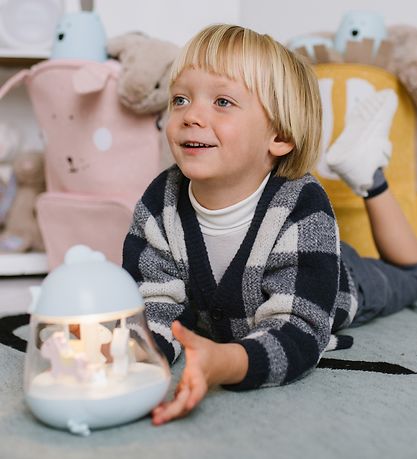 The Rabbit & Friends lamp gives good light and has seven different colours as well as normal light. It can either be a normal light, or a changing coloured light. On the bottom, there is a small knob which must be turned to make the horses run around and play sweet music.