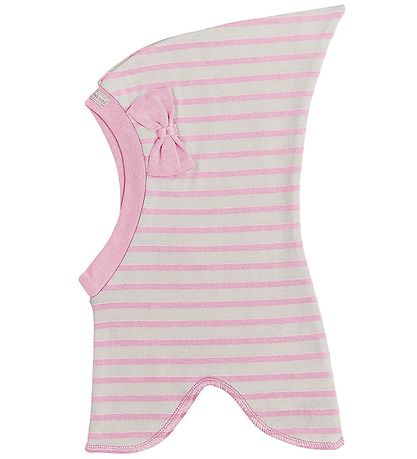 Beautiful Racing Kids balaclava in beige, with horizontal stripes in pink. On the left side there is a sweet bow.