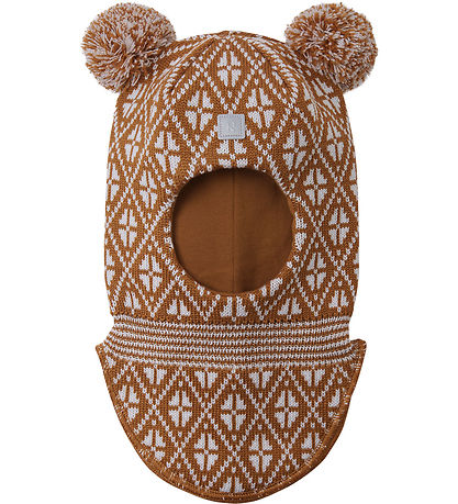 Nice Reima balaclava in cinnamon brown with an adorable white pattern. The Balaclava has a logo reflex on the front and two pom-pom on top.