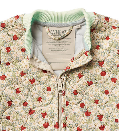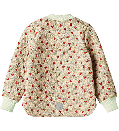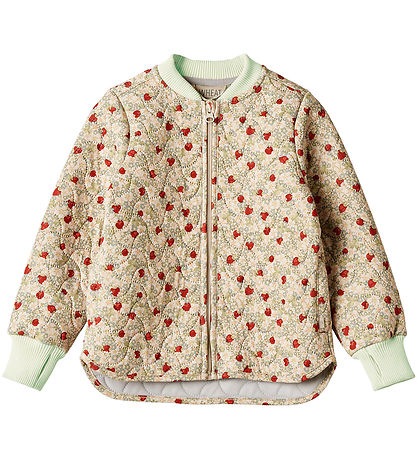 Beautiful Wheat thermo jacket in beige with an allover print of strawberry plants. The Thermo jacket has a billowing, quilted structure.