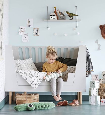 Le Done by Deer est placé sur un côté long du lit mesurant 60x120 cm. Le bord haut garantit que l'enfant ne tombe pas du lit la nuit.