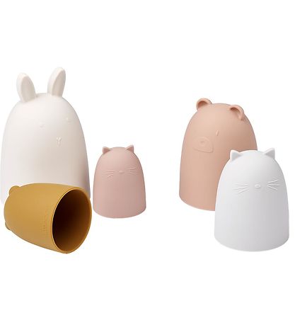 blocs empilables Liewood fins en rose, rose clair, ivoire blanc, marron caramel et blanc avec un design comme les animaux mignons de Liewood.