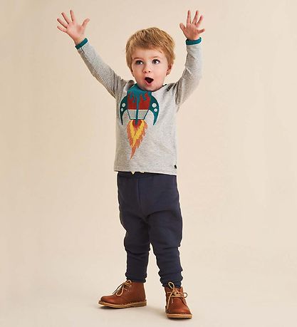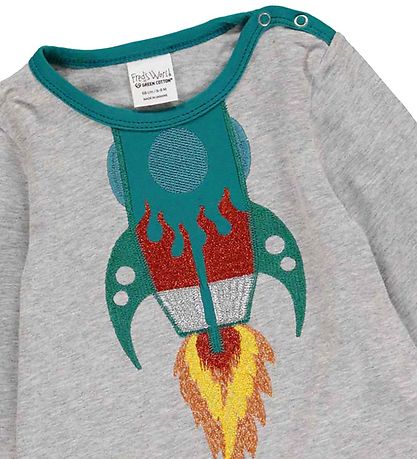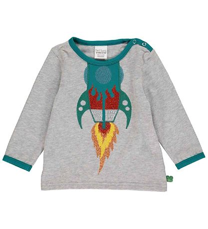 blouse cool Freds World en gris chiné, et sur le devant il y a une grand application avec une fusée spatiale vert avec du feu dans la cravate en rouge, jaune et orange avec des brillant.