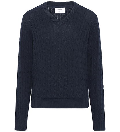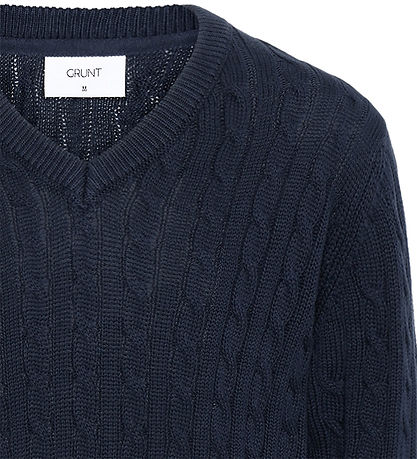 Magnifique blouse Grunt bleu marine avec une jolie maille torsadée. Chemisier présente un col V et des manches longues à bords côtelés.