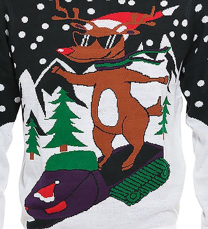 Chemisier Jule-Sweaters blouse en vert foncé en haut et blanc en bas, et sur le devant il y a une image d'un renne debout sur une motoneige violet.