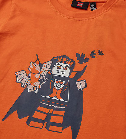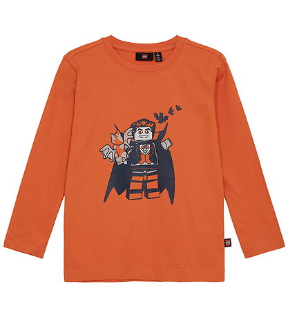 blouse chemisier LEGO® Wear à manches longues, d'un orange éclatant. Chemisier est orné d'un motif humoristique représentant une figurine LEGO® déguisée en vampire. Des chauves-souris volent autour de la figurine.