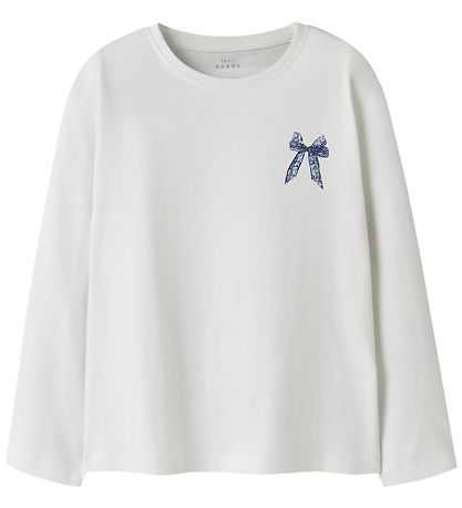 Élégant blouse Name It à manches longues, d'un blanc classique. Chemisier d'une encolure tour, il est orné d'un fin nœud bleu imprimé sur la poitrine. Name It met en valeur une esthétique simple et élégante, ce qui le rend intemporel et polyvalent.