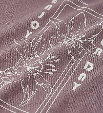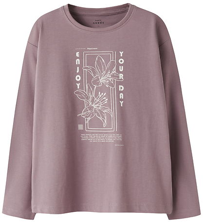 Élégant blouse Name It à manches longues, d'un violet cendré. Sur le devant, un imprimé floral artistique et l'inscription « Enjoy de votre journée » apportent une touche unique.