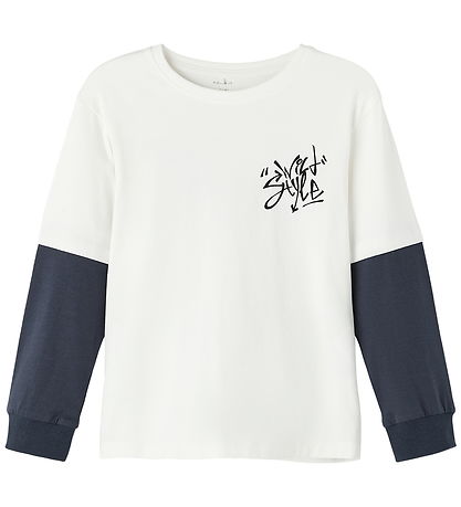 blouse moderne Name It blanc avec manches bleu foncé contrastantes. Sur le devant, un imprimé décoratif inspiré du graffiti porte le texte « Wild Style ». Au dos, un grand texte est imprimé, barré de graffiti orange, bleu clair et noir.