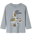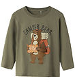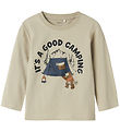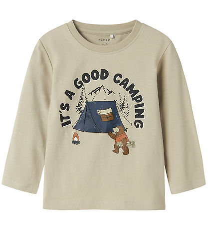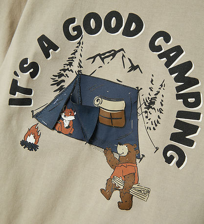 blouse beige « Nice Name It » avec imprimé camping sur le devant. La tente s'ouvre pour cacher une adorable petite silhouette. En haut, on peut lire « It's a good camping». Ce Chemisier présente une encolure tour à bord côtelé fin et des manches longues.