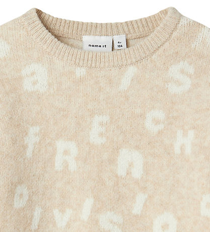 Joli chemisier Name It en blouse beige tricoté d'un imprimé all-over de lettre blanches. Chemisier présente une encolure tour et des manches longues à bords côtelés.
