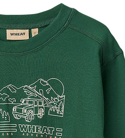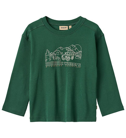 Magnifique blouse Wheat dans une teinte vert foncé et avec un imprimé minimaliste sur le devant d'un paysage avec des montagnes, des arbres et une voiture, créant un motif aventureux.